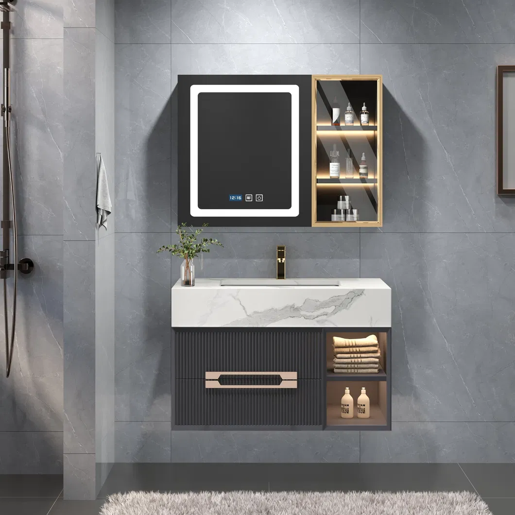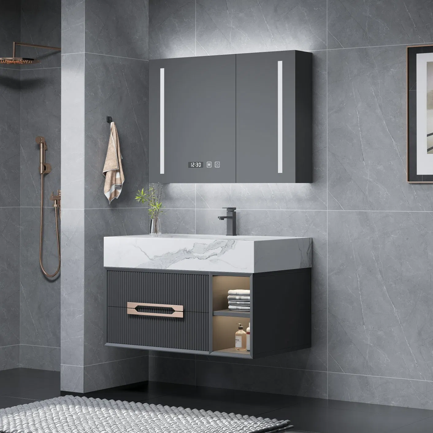 Grey Color Modern New Design Wall Mounted LED Lighted Mirror Bathroom Vanity Cabinet with Rock Plate Sink and Marble Top